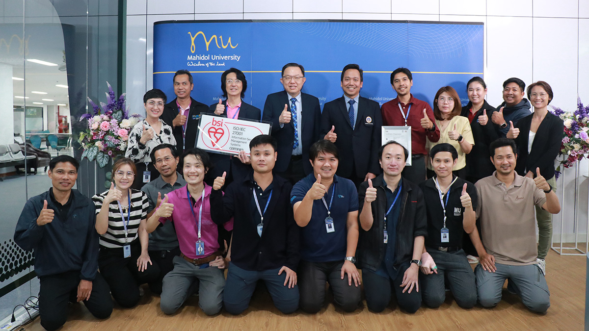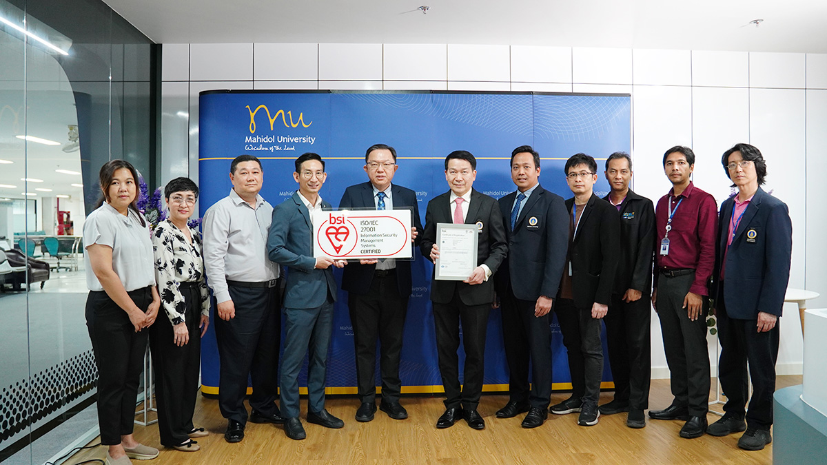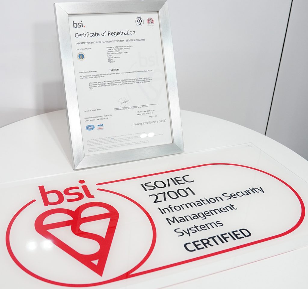 เมื่อวันอังคารที่ 11 มีนาคม 2568 มหาวิทยาลัยมหิดลได้จัดพิธีรับมอบประกาศนียบัตรใบรับรองมาตรฐาน ISO/IEC 27001:2022 ด้านระบบการจัดการความมั่นคงปลอดภัยของสารสนเทศ ภายใต้ Scope “Information Security Management System for Data Center Infrastructure at the Division of Information Technology Office of the President Mahidol University (Salaya Campus)” ณ กองเทคโนโลยีสารสนเทศ อาคารสำนักงานอธิการบดี ชั้น 1 มหาวิทยาลัยมหิดล ศาลายา เพื่อเฉลิมฉลองความสำเร็จในการพัฒนาระบบการจัดการความมั่นคงปลอดภัยของข้อมูลในองค์กร ตามมาตรฐานสากลที่ได้รับการรับรอง
