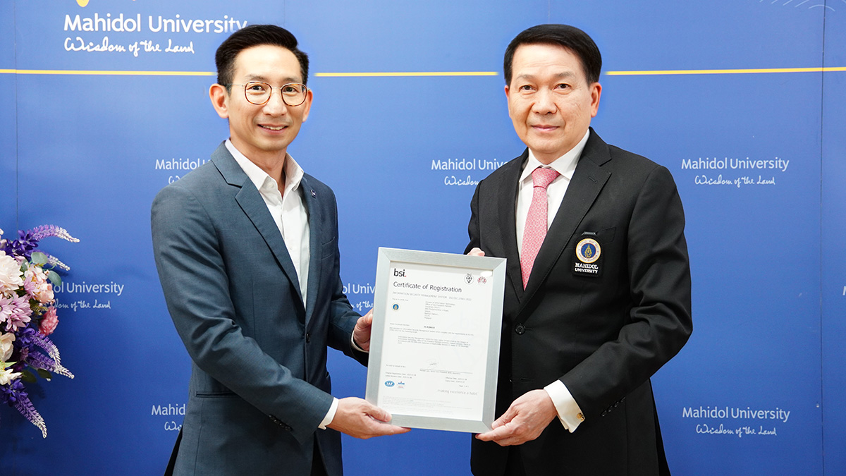 งานดังกล่าวได้รับเกียรติจากศาสตราจารย์ นพ. ปิยะมิตร ศรีธรา อธิการบดีมหาวิทยาลัยมหิดล ซึ่งดำรงตำแหน่งประธานในพิธีรับมอบประกาศนียบัตร พร้อมด้วยรองศาสตราจารย์ นายแพทย์เชิดชัย นพมณีจำรัสเลิศ รองอธิการบดีฝ่ายสารสนเทศและดิจิทัลทรานส์ฟอร์เมชัน, ดร. ภทรภรต ภภัทร์สทธรรม ที่ปรึกษามหาวิทยาลัยด้านสารสนเทศและดิจิทัลทรานส์ฟอร์เมชัน, ผู้ช่วยศาสตราจารย์ ดร. นริศ หนูหอม ผู้ช่วยอธิการบดีฝ่ายสารสนเทศและดิจิทัลทรานส์ฟอร์เมชัน รักษาการแทนผู้อำนวยการกองเทคโนโลยี รับมอบประกาศนียบัตรใบรับรองมาตรฐาน ISO/IEC 27001:2022 ด้านระบบการจัดการความมั่นคงปลอดภัยของสารสนเทศ จาก นายกุลธัช บุญบงการ ผู้จัดการประจำประเทศ บริษัท บีเอสไอ กรุ๊ป (ประเทศไทย)