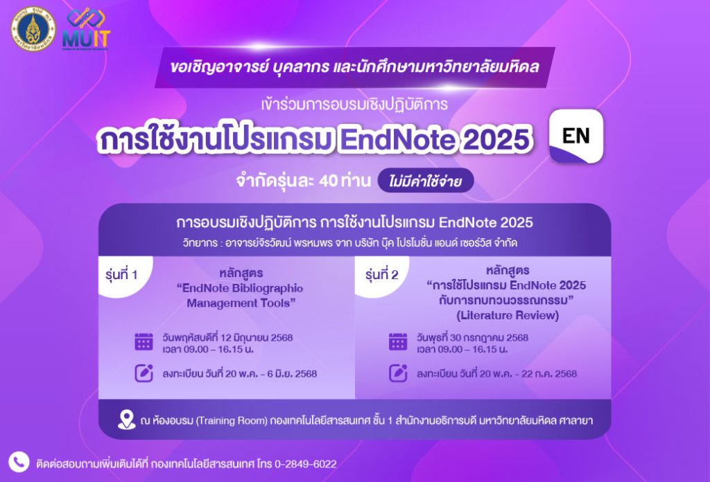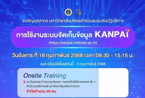 วันที่ 14 – 15 มกราคม พ.ศ. 2569 เวลา 09.00 – 16.00 น.ณ ห้องอบรม (Training Room) กองเทคโนโลยีสารสนเทศ ชั้น 1 อาคารสำนักงานอธิการบดี มหาวิทยาลัยมหิดล […]
