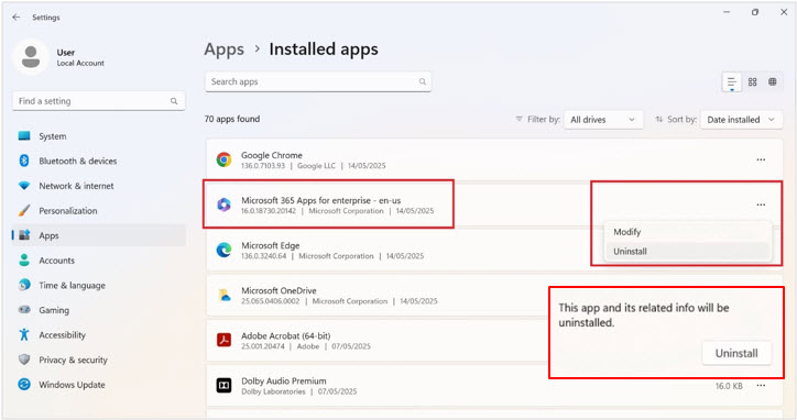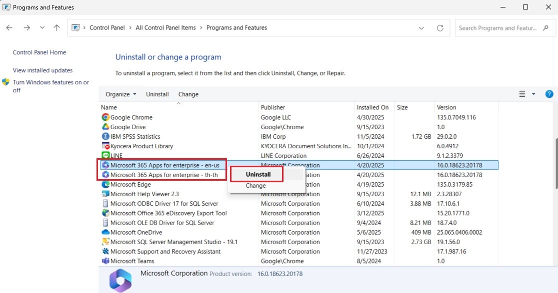การถอนการติดตั้ง Microsoft 365 สำหรับ Windows