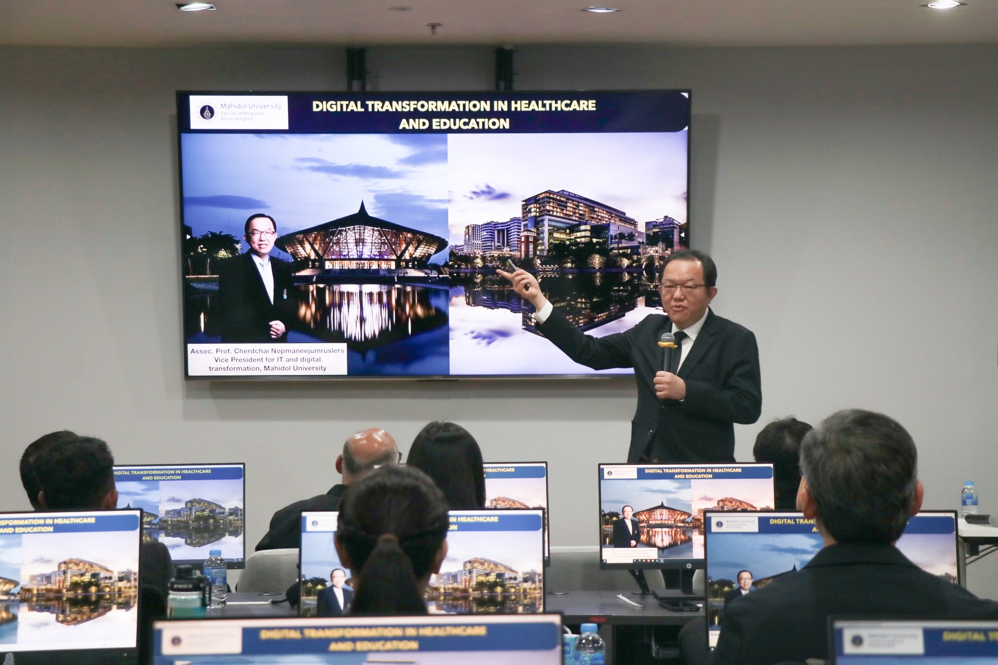 วันที่ 6 พฤศจิกายน 2568 รองศาสตราจารย์ นายแพทย์เชิดชัย นพมณีจำรัสเลิศ รองอธิการบดีฝ่ายสารสนเทศและดิจิทัลทรานส์ฟอร์เมชัน ให้การต้อนรับคณะศึกษาดูงานภายใต้หลักสูตร CHI Fellowship in Healthcare Innovation & Leadership 2025 (ครั้งที่ 5) โดยความร่วมมือระหว่าง Centre for Healthcare Innovation (CHI) ในการดูแลของโรงพยาบาล Tan Tock Seng ประเทศสิงคโปร์ กับ ศูนย์ขับเคลื่อนคุณค่าการบริการ คณะแพทยศาสตร์ศิริราชพยาบาล มหาวิทยาลัยมหิดล อีกทั้งยังให้เกียรติบรรยายในหัวข้อ “Digital Transformation in Healthcare & Educational Sectors” และได้มีการร่วมแลกเปลี่ยนเรียนรู้ประสบการณ์เกี่ยวกับเครื่องมือและเทคโนโลยีสมัยใหม่ เพื่อผลักดันให้เกิดการสร้างนวัตกรรมทางแพทย์ และนำมาประยุกต์ใช้ในองค์กร รวมถึงพัฒนาศักยภาพในการบริหารและทักษะในการเป็นผู้นำในยุคดิจิทัล ณ กองเทคโนโลยีสารสนเทศ ชั้น 1 อาคารสำนักงานอธิการบดี มหาวิทยาลัยมหิดล ศาลายา