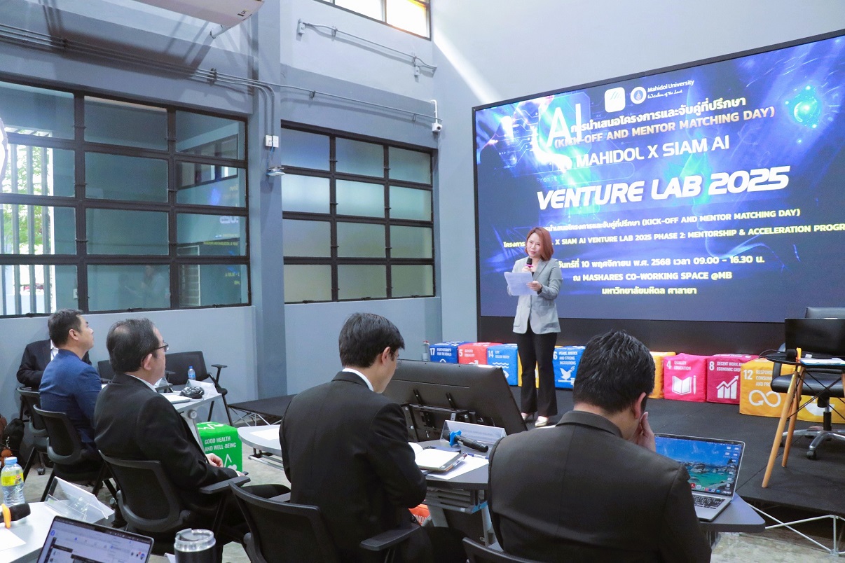 วันที่ 10 พฤศจิกายน 2568 รศ.นพ.เชิดชัย นพมณีจำรัสเลิศ รองอธิการบดีฝ่ายสารสนเทศและดิจิทัลทรานส์ฟอร์เมชัน มหาวิทยาลัยมหิดล เป็นประธานเปิดโครงการ “Mahidol x Siam AI Venture Lab 2025 Phase 2: Mentorship & Acceleration Program” ณ MaSHARES Co-working Space @MB มหาวิทยาลัยมหิดล ศาลายา ซึ่งโครงการนี้จัดขึ้นเพื่อ ผลักดันงานวิจัยและนวัตกรรมด้านปัญญาประดิษฐ์ (AI) ในสาขา การแพทย์และสุขภาพ ให้ต่อยอดสู่ ธุรกิจสตาร์ตอัป (Startup) โดยในรอบ Final Stage มีทีมผ่านการคัดเลือกทั้งสิ้น 9 ทีม เข้าร่วมเสนอผลงานและจับคู่ที่ปรึกษา ได้แก่