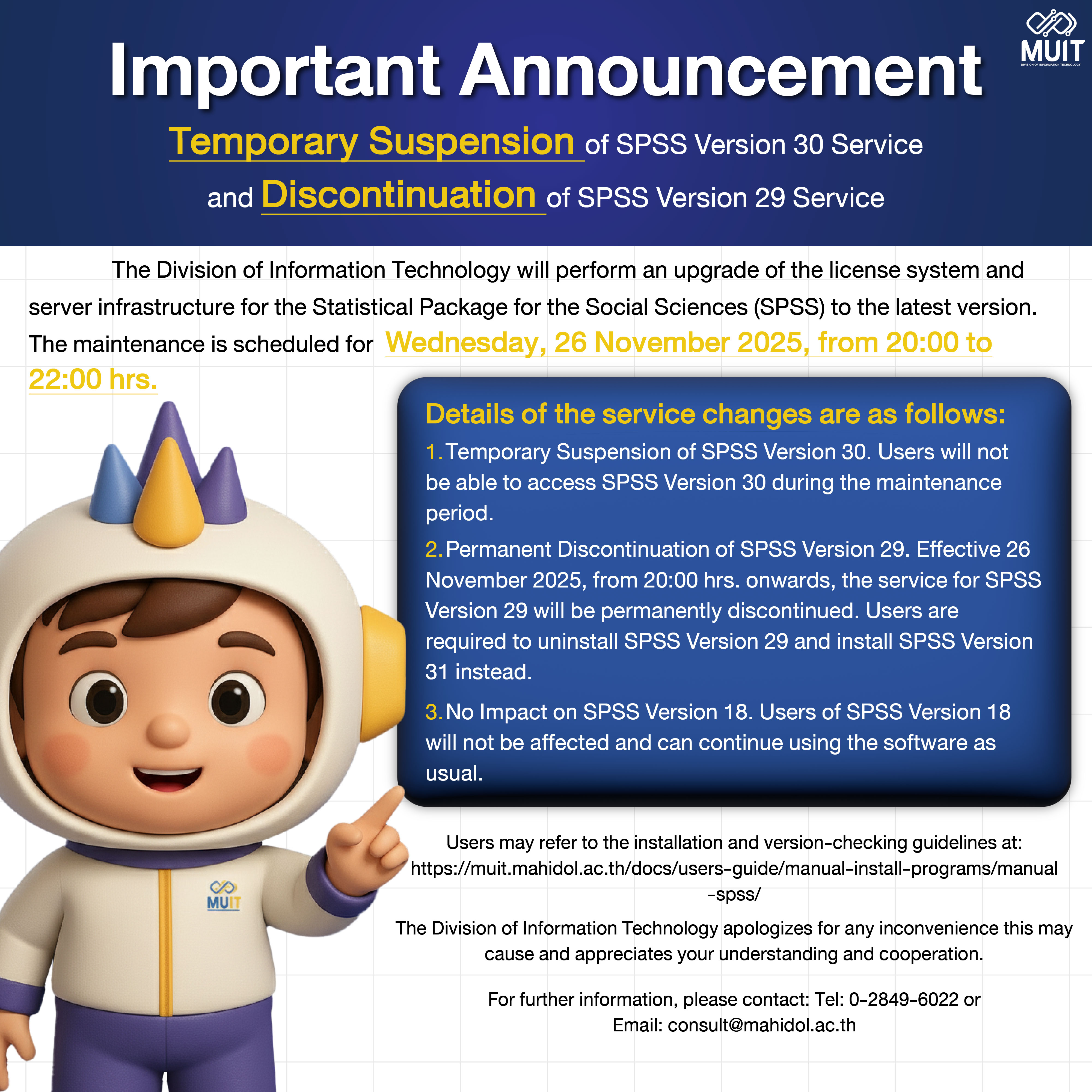 The Division of Information Technology apologizes for any inconvenience this may cause and appreciates your understanding and cooperation.For further information, please contact: Tel: 0-2849-6022 or Email: consult@mahidol.ac.th