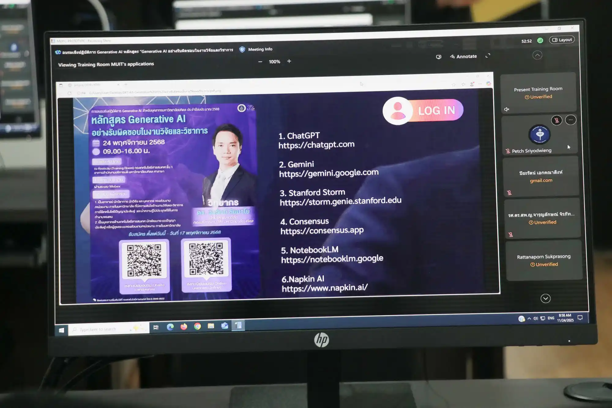 วันที่ 24 พฤศจิกายน 2568 ผู้ช่วยศาสตราจารย์ ดร.นริศ หนูหอม ผู้ช่วยอธิการบดีฝ่ายสารสนเทศและดิจิทัลทรานส์ฟอร์เมชัน รักษาการแทนผู้อำนวยการกองเทคโนโลยีสารสนเทศ เป็นประธานในพิธีเปิดอบรมเชิงปฏิบัติการ Generative AI สำหรับบุคลากรมหาวิทยาลัยมหิดล ประจำปีงบประมาณ 2569 หลักสูตร Generative AI อย่างรับผิดชอบในงานวิจัยและวิชาการ เพื่อถ่ายทอดองค์ความรู้และแนวทางการใช้ Generative AI อย่างถูกต้องตามหลักวิชาการและจริยธรรม อีกทั้งยังส่งเสริมให้อาจารย์ นักวิชาการ นักวิจัย และบุคลากร ของส่วนงาน/หน่วยงานต่างๆ ในมหาวิทยาลัยสามารถใช้เทคโนโลยีได้อย่างมีประสิทธิภาพ มีจริยธรรม และไม่ละเมิดสิทธิ และสร้างวัฒนธรรมการใช้ AI อย่างมีความรับผิดชอบ ปลอดภัย และยั่งยืนภายในองค์กร