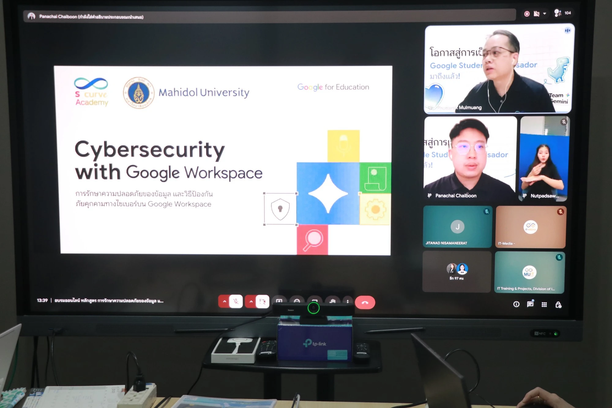 วันที่ 7 มกราคม 2569 นายมนตรี เดวีเลาะ รักษาการแทนรองผู้อำนวยการกองเทคโนโลยีสารสนเทศ เป็นประธานในพิธีเปิดอบรมออนไลน์ สำหรับนักศึกษา มหาวิทยาลัยมหิดล หลักสูตร การรักษาความปลอดภัยของข้อมูล และวิธีป้องกันภัยคุกคามทางไซเบอร์บน Google Workspace เพื่อให้นักศึกษาประยุกต์ใช้เครื่องมือหลักใน Google Workspace for Education Plus ได้อย่างมีประสิทธิภาพ อีกทั้งสามารถระบุและป้องกันภัยคุกคามทางไซเบอร์ที่พบบ่อยบน Google Workspace ได้ และใช้เครื่องมือรักษาความปลอดภัยของข้อมูลใน Google Workspace เพื่อปกป้องข้อมูลส่วนตัวและข้อมูลของมหาวิทยาลัย ทั้งยังทำงานร่วมกันและสื่อสารได้อย่างมีประสิทธิภาพผ่านเครื่องมือต่างๆ ใน Google Workspace
