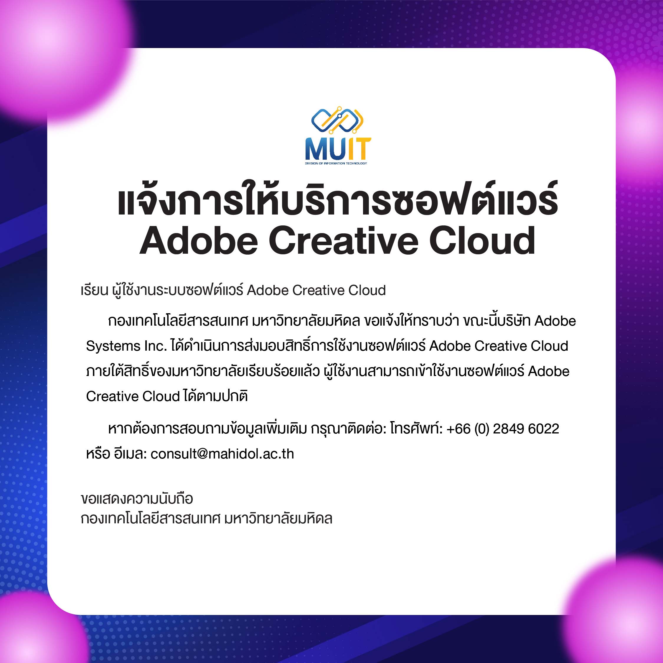 กองเทคโนโลยีสารสนเทศ มหาวิทยาลัยมหิดล ขอแจ้งให้ทราบว่า ขณะนี้บริษัท Adobe Systems Inc. ได้ดำเนินการส่งมอบสิทธิ์การใช้งานซอฟต์แวร์ Adobe Creative Cloud ภายใต้สิทธิ์ของมหาวิทยาลัยเรียบร้อยแล้ว ผู้ใช้งานสามารถเข้าใช้งานซอฟต์แวร์ Adobe Creative Cloud ได้ตามปกติ