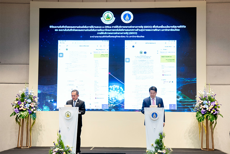 มหาวิทยาลัยมหิดลจัดพิธีลงนามบันทึกข้อตกลงความร่วมมือในการใช้งานระบบ e-Office และ ลงนามในบันทึกข้อตกลงความร่วมมือในการพัฒนาโครงการเทคโนโลยีสารสนเทศทางด้านสุขภาพและการศึกษา ภายใต้บริการคลาวด์กลางภาครัฐ (GDCC Cloud) ร่วมกับ กระทรวงดิจิทัลเพื่อเศรษฐกิจและสังคม