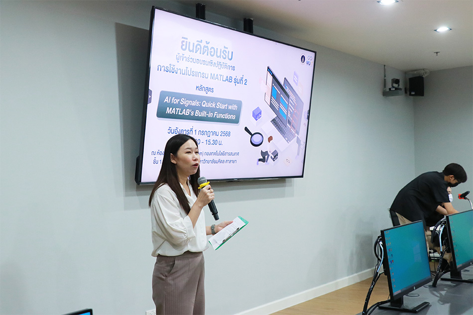 วันที่ 1 กรกฏาคม 2568 กองเทคโนโลยีสารสนเทศ ได้จัดอบรมเชิงปฏิบัติการรุ่นที่ 2 การใช้งานโปรแกรม MATLAB หลักสูตร “AI for Signals: Quick Start with MATLAB's Built-in Functions” โดยมีวิทยากรอาจารย์กัณฐิกา วงษ์เกษม จาก บริษัท แอสเซนดาส ซิสเทมส์ จำกัด ซึ่งมีหัวข้อที่น่าสนใจอาทิ Introduction to AI for Signal Processing, Signal Preprocessing for AI, Training and Evaluating AI Models และ Deploying AI Models for Real-World Applications เป็นต้น โดยมีวัตถุประสงค์เพื่อส่งเสริมให้อาจารย์ บุคลากร และนักศึกษามหาวิทยาลัยมหิดล มีความเข้าใจและสามารถใช้โปรแกรม MATLAB สำหรับการใช้งานที่หลากหลายได้ โดยจัดอบรมในรูปแบบ Onsite Training ณ ห้องอบรม (Training Room) ชั้น 1 กองเทคโนโลยีสารสนเทศ มหาวิทยาลัยมหิดล ศาลายา