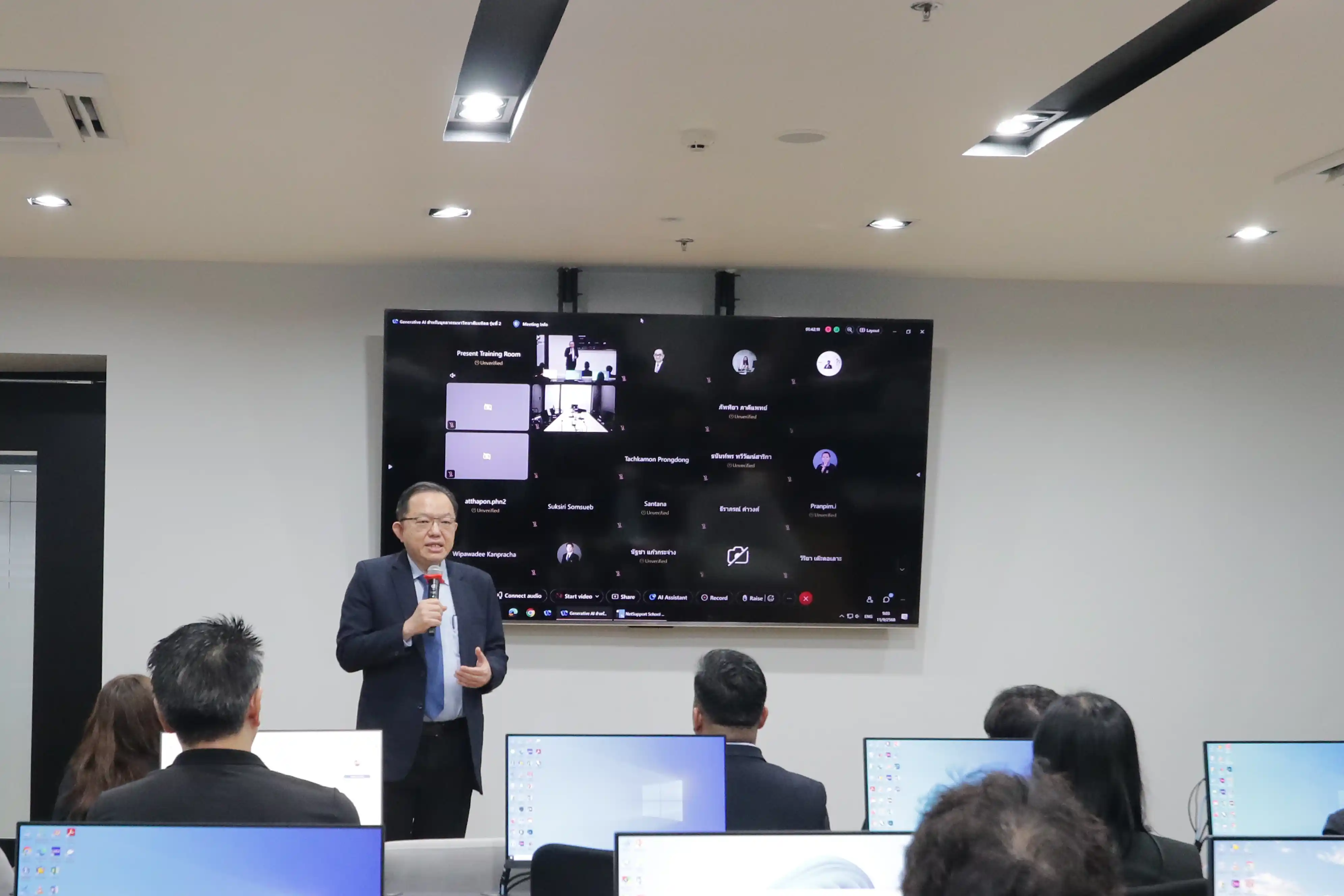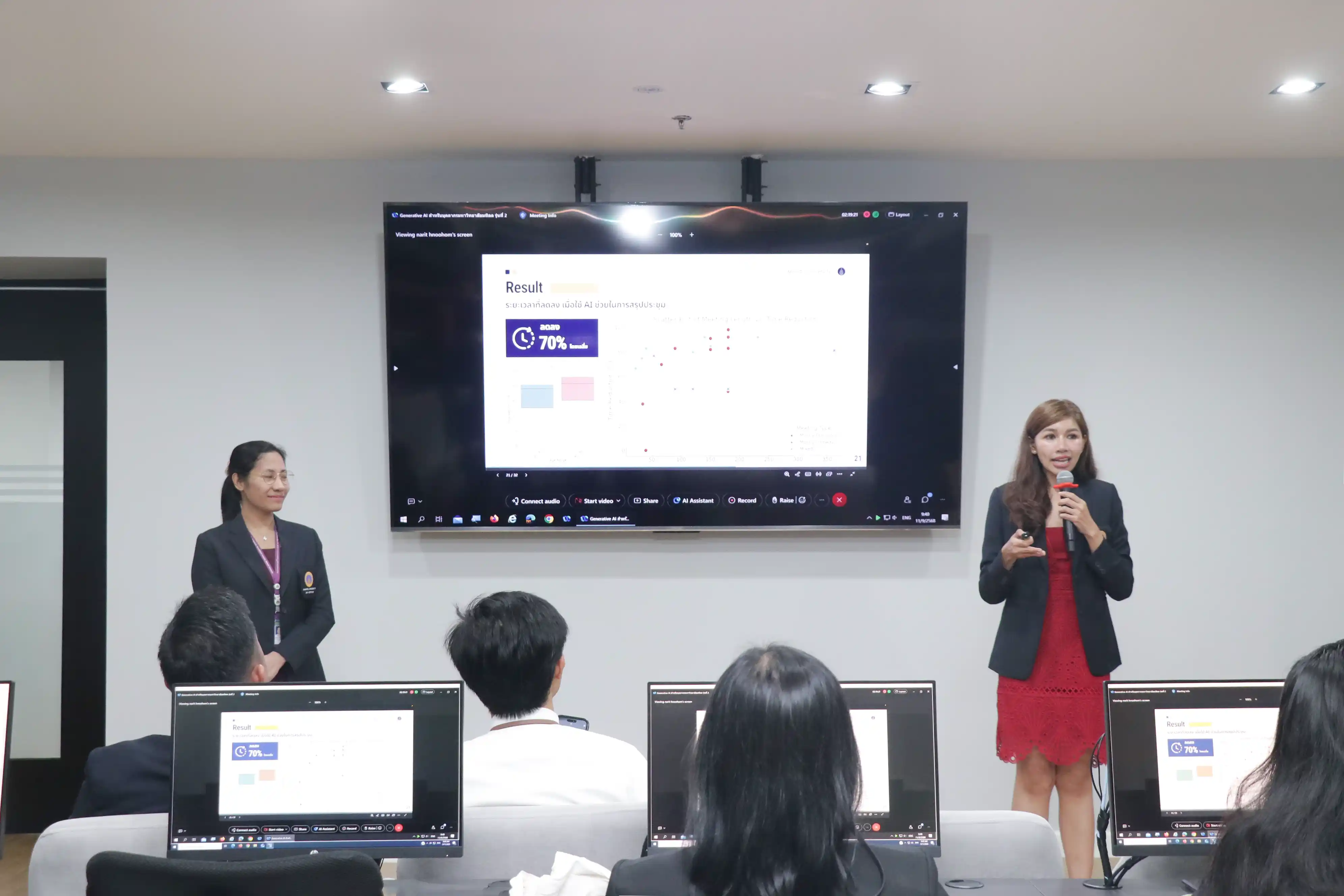 ในการอบรมครั้งนี้ได้รับเกียรติจากผู้บริหารส่วนงานร่วมแลกเปลี่ยนเรียนรู้ผลงานวิจัย เรื่อง การเปลี่ยนผ่านองค์กรด้วย AI : กรณีศึกษาการใช้ Generative AI เพื่อสรุปประชุม (AI-Driven Digital Transformation A Case Study in Generative AI for Meeting Summary) ซึ่งจัดขึ้นในรูปแบบ Hybrid ณ ห้องอบรม (Training Room) กองเทคโนโลยีสารสนเทศ ชั้น 1 อาคารสำนักงานอธิการบดี มหาวิทยาลัยมหิดล ศาลายา และผ่านระบบ Webex Meeting สำหรับผู้เข้าร่วมออนไลน์