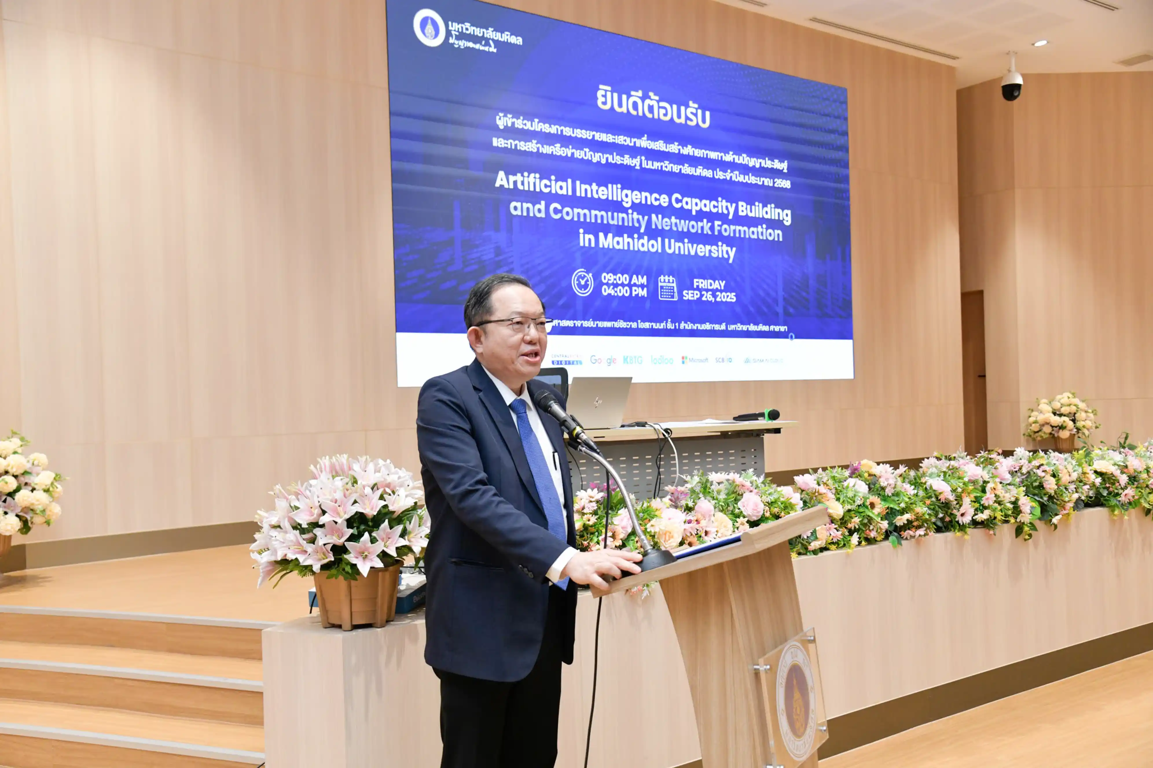 วันศุกร์ ที่ 26 กันยายน 2568 รองศาสตราจารย์ นายแพทย์เชิดชัย นพมณีจำรัสเลิศ รองอธิการบดีฝ่ายสารสนเทศและดิจิทัลทรานส์ฟอร์เมชัน มหาวิทยาลัยมหิดล เป็นประธานกล่าวเปิดงานโครงการบรรยายและเสวนาเพื่อเสริมสร้างศักยภาพทางด้านปัญญาประดิษฐ์และการสร้างเครือข่ายปัญญาประดิษฐ์ในมหาวิทยาลัยมหิดล ประจำปีงบประมาณ 2568 “Artificial Intelligence Capacity Building and Community Network Formation in Mahidol University” เพื่อสร้างความรู้ความเข้าใจเกี่ยวกับปัญญาประดิษฐ์ ให้แพร่หลายในหมู่บุคลากร และสร้างกลไกความร่วมมือที่เข้มแข็ง แสดงถึงศักยภาพของมหาวิทยาลัยมหิดลที่พร้อมจะขับเคลื่อนไปสู่มหาวิทยาลัยปัญญาประดิษฐ์ อีกทั้งยังให้เกียรติบรรยายในหัวข้อ “บทบาทบุคลากรด้าน AI: ขับเคลื่อนมหิดลสู่มหาวิทยาลัยปัญญาประดิษฐ์” ณ ห้องบรรยายศาสตราจารย์นายแพทย์ชัชวาล โอสถานนท์ ชั้น 1 สำนักงานอธิการบดี มหาวิทยาลัยมหิดล ศาลายา