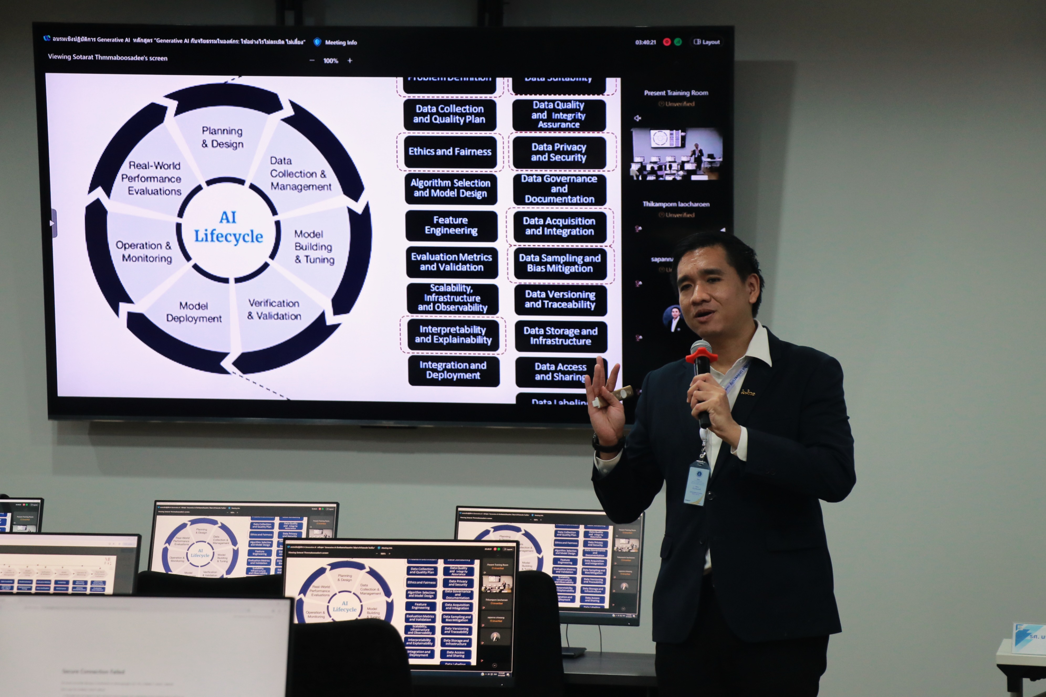 วันที่ 16 ตุลาคม 2568 รองศาสตราจารย์ นายแพทย์เชิดชัย นพมณีจำรัสเลิศ รองอธิการบดีฝ่ายสารสนเทศและดิจิทัลทรานส์ฟอร์เมชัน มหาวิทยาลัยมหิดล เป็นประธานกล่าวเปิดโครงการอบรมเชิงปฏิบัติการหลักสูตร "Generative AI กับจริยธรรมในองค์กร: ใช้อย่างไรไม่ละเมิด ไม่เสี่ยง" โดยมี ผู้ช่วยศาสตราจารย์ ดร.โษฑศ์รัตต ธรรมบุษดี ผู้ช่วยคณบดีฝ่ายการเปลี่ยนแปลงทางดิจิทัลขององค์กร คณะวิศวกรรมศาสตร์ มหาวิทยาลัยมหิดล เป็นวิทยากรในการบรรยาย เพื่อถ่ายทอดองค์ความรู้และแนวทางปฏิบัติในการใช้งาน Generative AI ที่ถูกต้องพร้อมเสริมความรู้ ความเข้าใจ และจิตสำนึกด้านจริยธรรมแนวทางปฏิบัติที่เหมาะสมให้แก่อาจารย์ นักวิจัย และบุคลากร ของส่วนงาน/หน่วยงานต่าง ๆ ภายในมหาวิทยาลัยมหิดล ณ ห้องอบรม (Training Room) กองเทคโนโลยีสารสนเทศ ชั้น 1 อาคารสำนักงานอธิการบดี มหาวิทยาลัยมหิดล ศาลายา