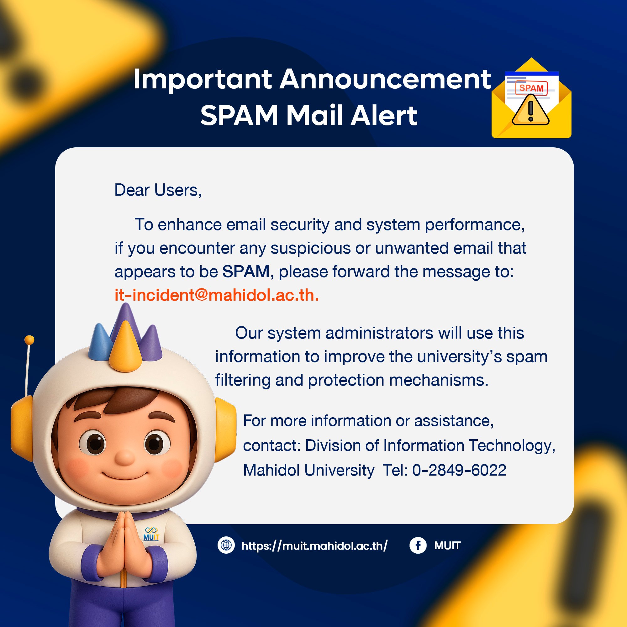 เพื่อเป็นการยกระดับความปลอดภัยและประสิทธิภาพของระบบอีเมล หากท่านตรวจพบอีเมลที่เข้าข่ายเป็นอีเมลขยะ (SPAM Mail) กรุณาส่งต่อ (Forward) อีเมลฉบับนั้นมายัง it-incident@mahidol.ac.th